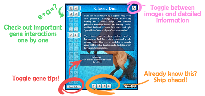 An educational web game teaching the ins and outs of horse coat color genetics. Jennifer Hoffman was responsible for all aspects of this game including: genetics research, game design, layout, graphics creation, scripting.